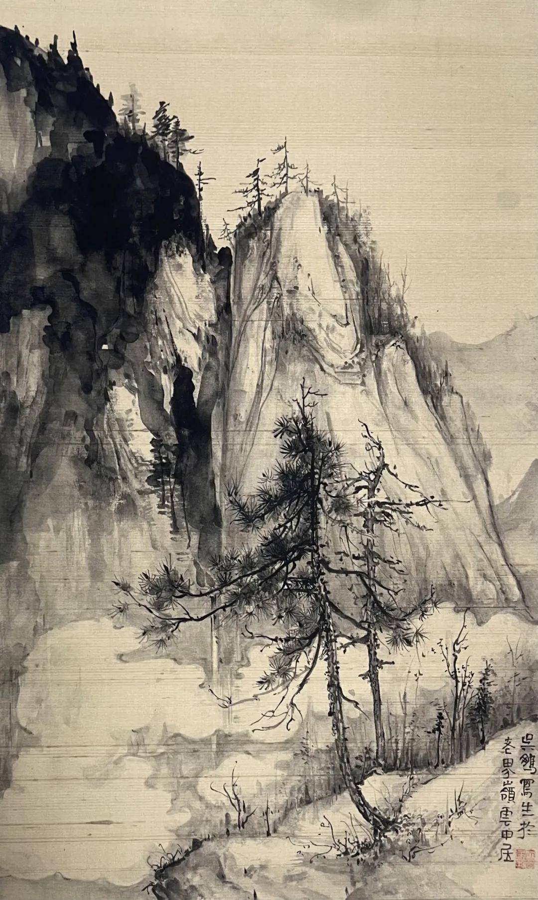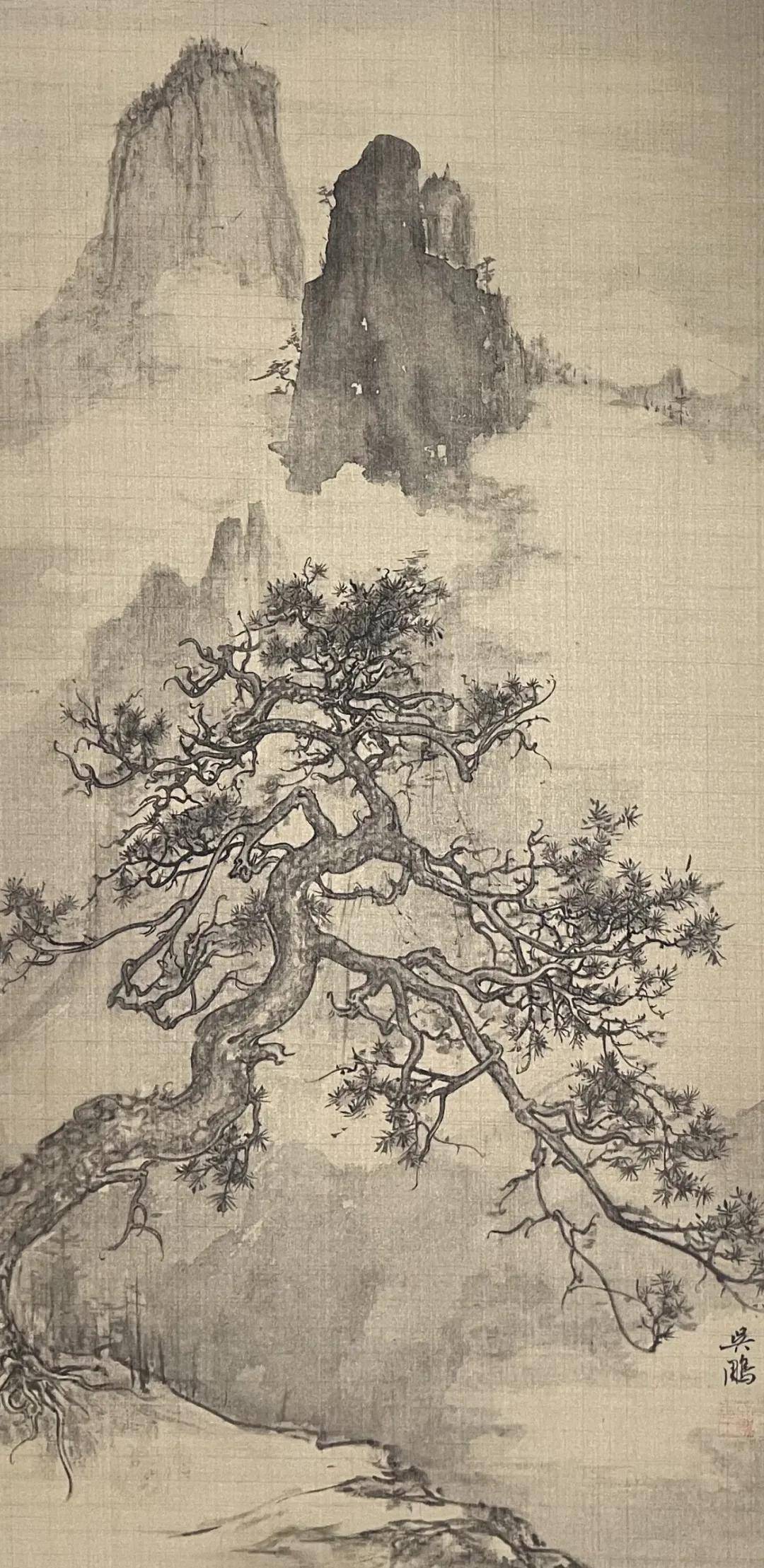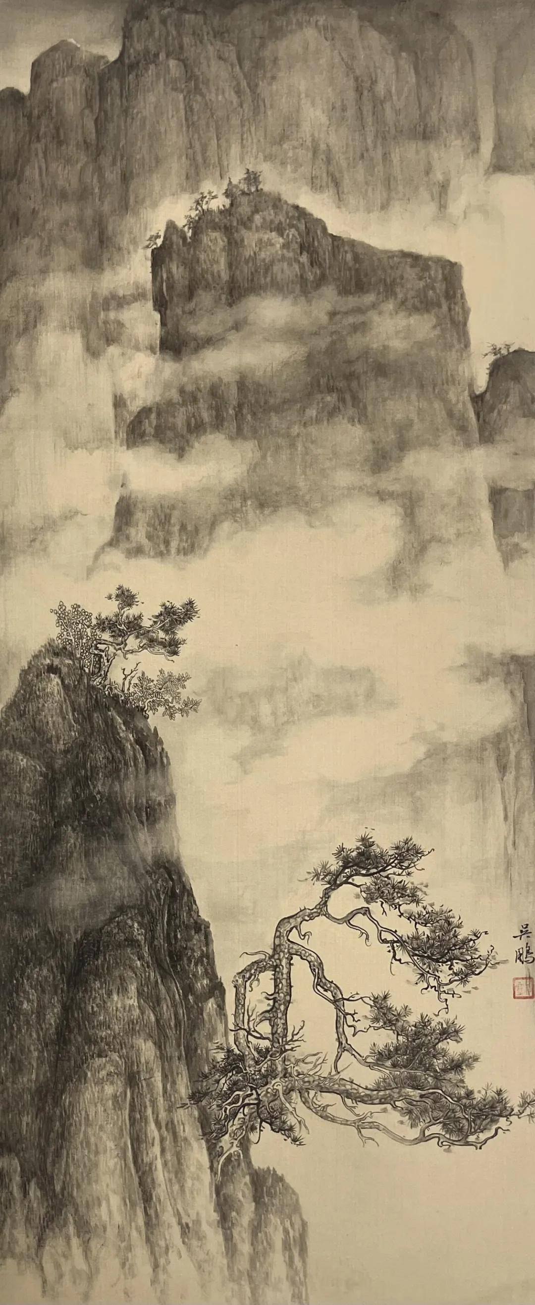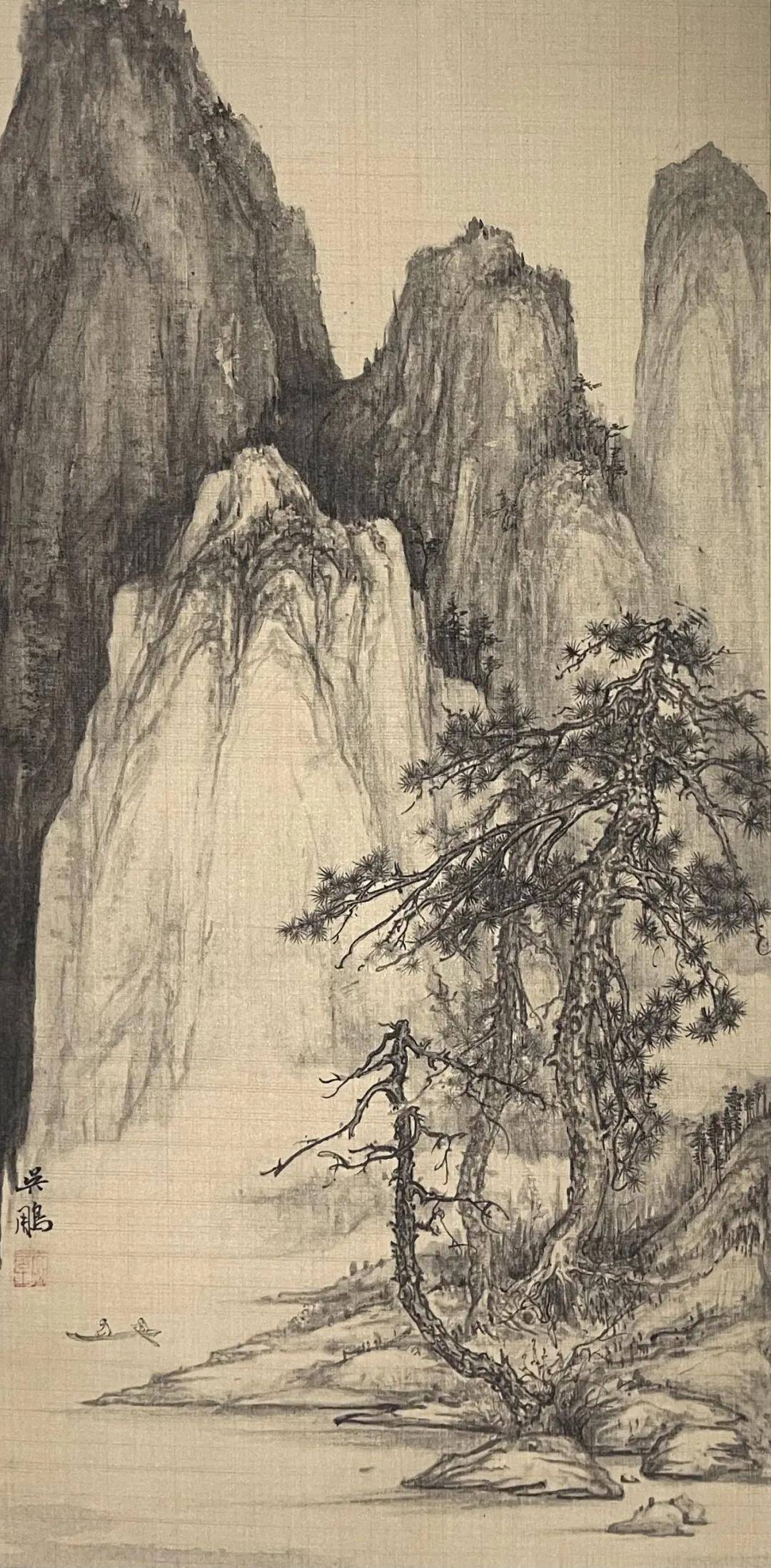 吴鹏《峡江孤帆》 中国画 2025年 在画作中,吴鹏或用斧劈皴精准展现山石质感,墨色浓淡适宜,尽显“壁立千仞”的豪迈;或采用披麻皴晕染山峦层叠,墨色淡逸如烟,暗藏“云深不知处”的空灵。墨色在宣纸上交织、晕散,最终营造出“山川浑厚,草木华滋”的独特意境。恰如宗炳在《画山水序》中所说“竖画三寸,当千仞之高;横墨数尺,体百里之迥”,吴鹏以有限笔墨,将祖国山河的壮美与灵秀熔于一炉,让观者在尺幅间感受山河万里的磅礴,进而心生对华夏大地的敬畏。 二、树:笔塑风骨,暗合君子品格 “画树者,当知树人之理。”吴鹏画树,不只是描摹树的形态,更是以树为喻,书写个人的人格精神。他尤擅画松,笔下的松树,或生于悬崖峭壁,虬枝盘曲却始终向上,尽显“咬定青山不放松”的坚韧;或立于溪畔山巅,枝干舒展若迎客,暗藏“君子之德风”的谦和。