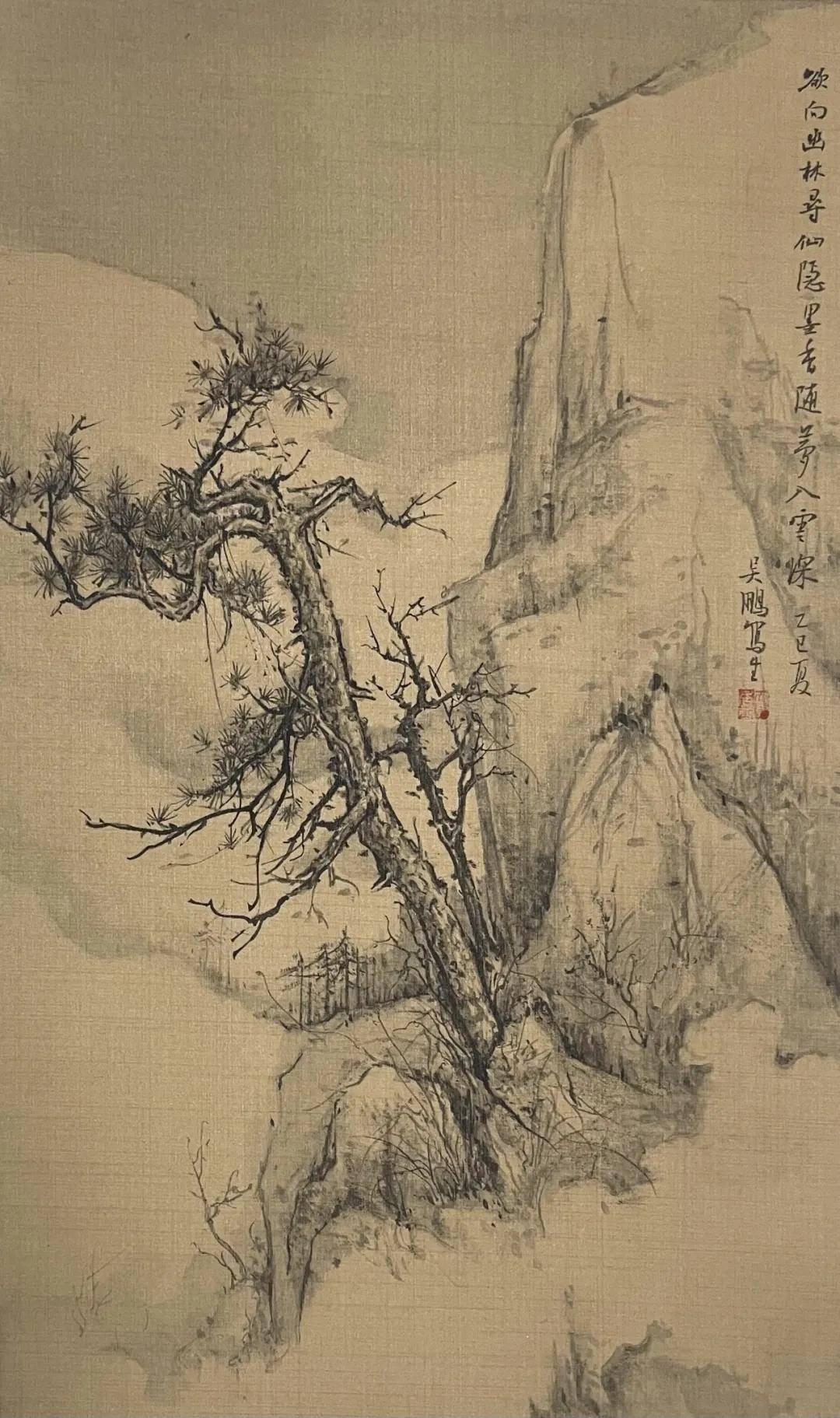 吴鹏《苍松出岫》 中国画 2025年 细看其笔下树木,树干以焦墨勾勒,线条遒劲如铁,似老者布满皱纹的手掌,承载岁月的沧桑;枝叶以淡墨点染,疏密有致,如君子舒张的衣襟,透着灵动生机。有时,他会在松畔添几簇劲草,草叶偃仰与松针挺劲相映,暗合“松草共生、傲立风霜”的文人意趣;有时,则让孤树独立于山岩中,枝干疏朗却风骨凛然,恰似陶渊明“不为五斗米折腰”的气节。