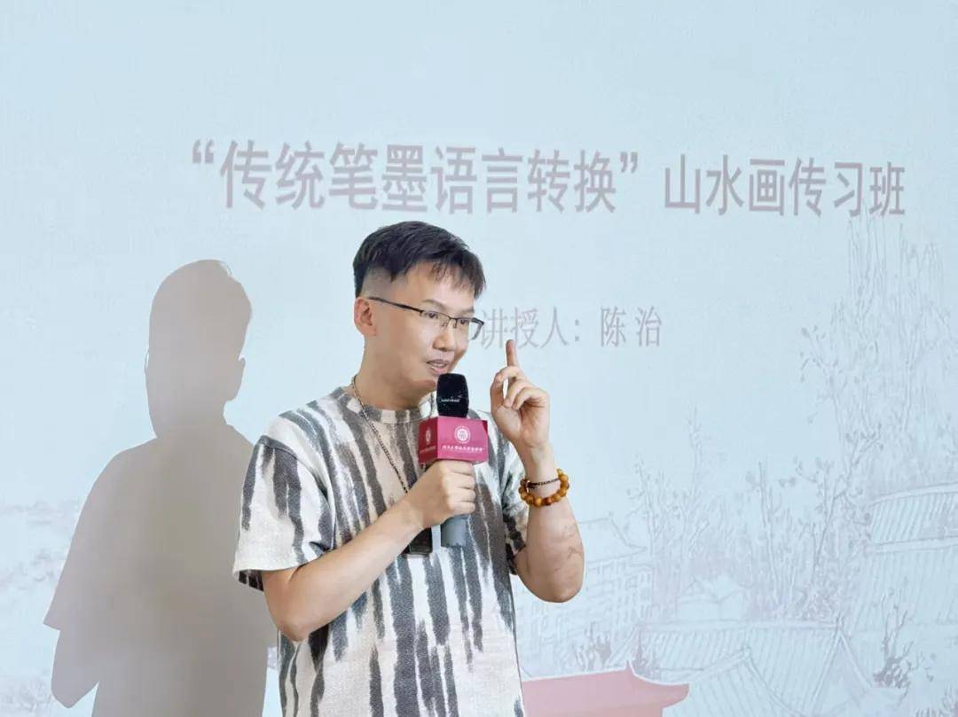 课程开篇,陈治以传统书画理论为根基,结合自身多幅入选全国美展的作品,拆解山水画的笔墨逻辑。他特别强调“书写性”的重要性:“山水画的每一笔都应如书法般有筋骨,中锋行笔求稳,侧锋皴擦取意,墨色的浓淡干湿不是随机变化,而是对山石肌理、云水气韵的主动诠释。”为让学员直观感受笔墨魅力,他现场示范创作,引得学员频频驻足细观。