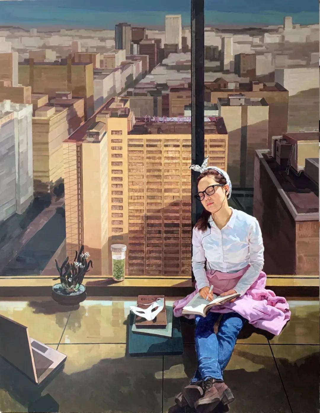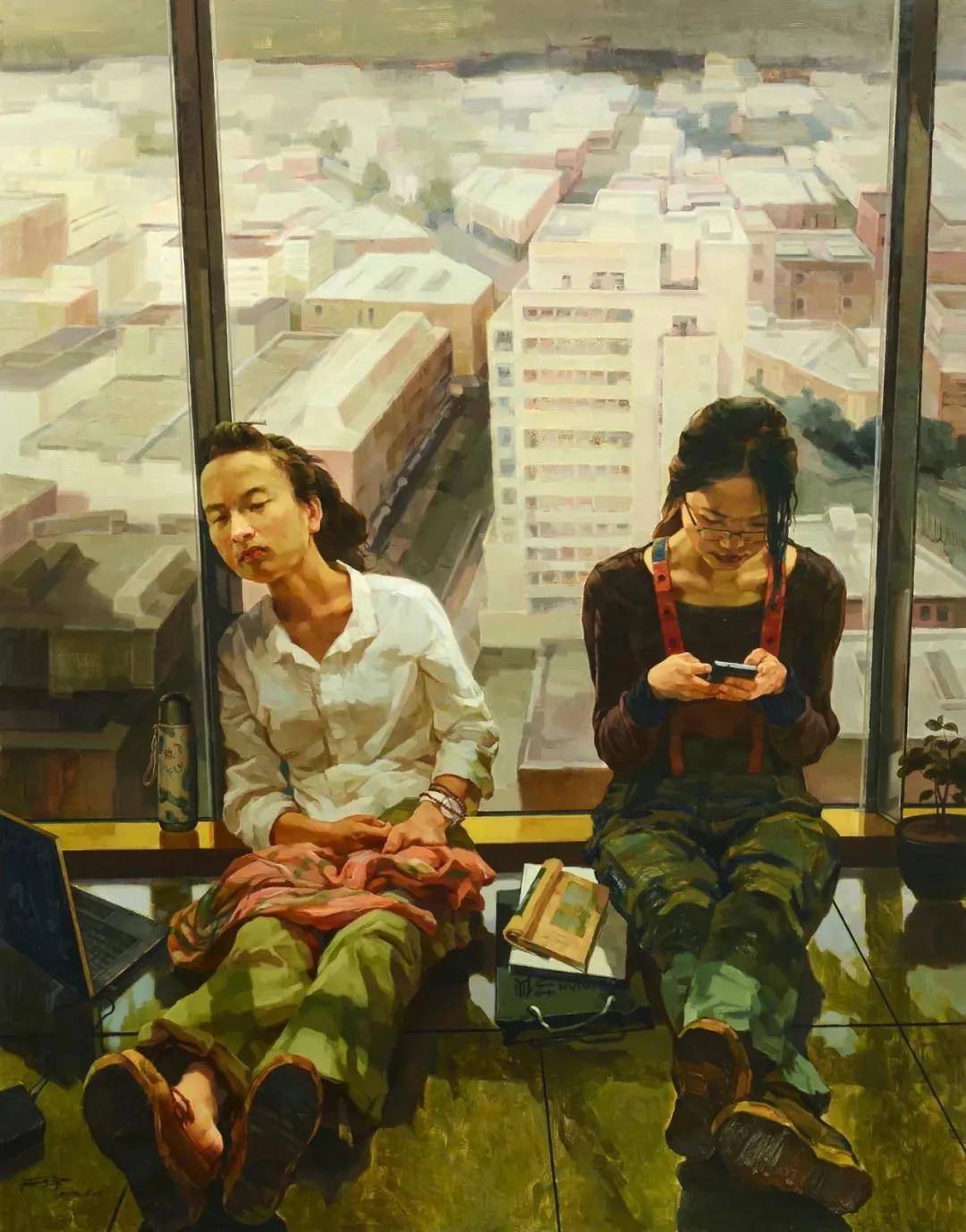 严子宇《画里苏杭 声闻于天》 50cm x 86cm 油画 此次画展以“繁花—枝干—土壤”的生态逻辑,完整呈现严子宇的创作脉络与价值维度。 枝干之挺,在于5件国家级获奖作品的专业高度。这些作品在全国性赛事中脱颖而出,既是学院派技法的精湛演绎,更是东方美学的创新表达。如《青涩时代-最初梦想2》以城市景观为背景的肖像作品,以细腻的人物刻画与富有张力的色彩控制,将个体生命置于时代语境中,完成了人文精神与油画语言的深度对话;另一幅融合传统山水元素的肖像创作,则以“人景交融”的意境营造,为“油画肖像东方化”提供了极具价值的创作范式。