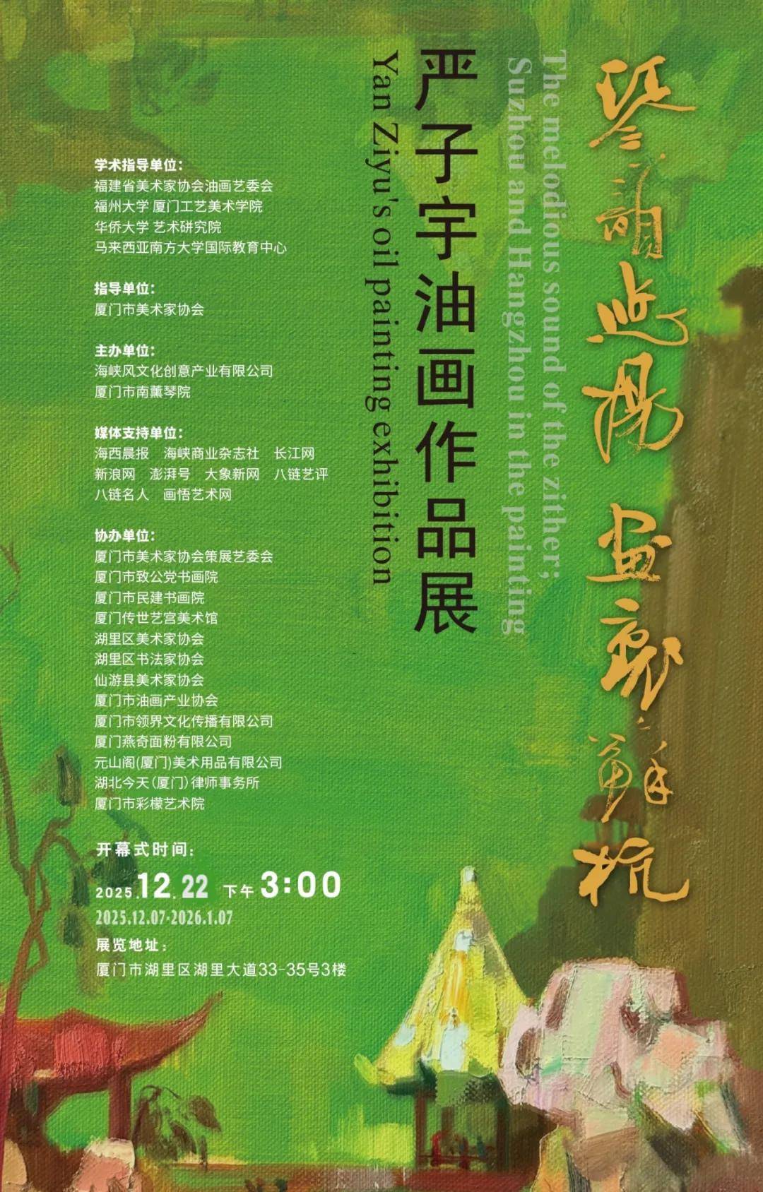 严子宇,中国美术家协会会员,华侨大学美术学院艺术导师,福建省仙游县美术家协会副主席,厦门市湖里区美术家协会副主席,厦门市美术家协会策展专业委员会秘书长,厦门市美术家协会油画艺术委员会副秘书,福建厦门远东美术馆副馆长。 文/青问 2025年12月22日,著名画家严子宇“琴韵悠扬 画里苏杭”油画作品展将在厦门市湖里区正式开幕。