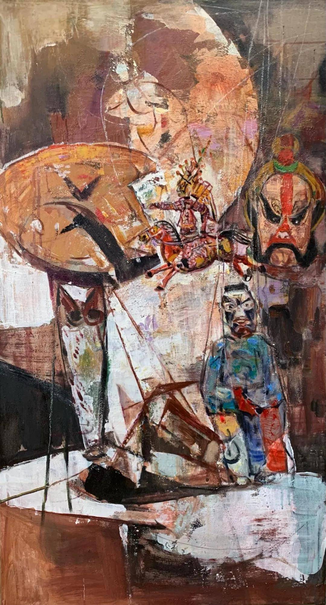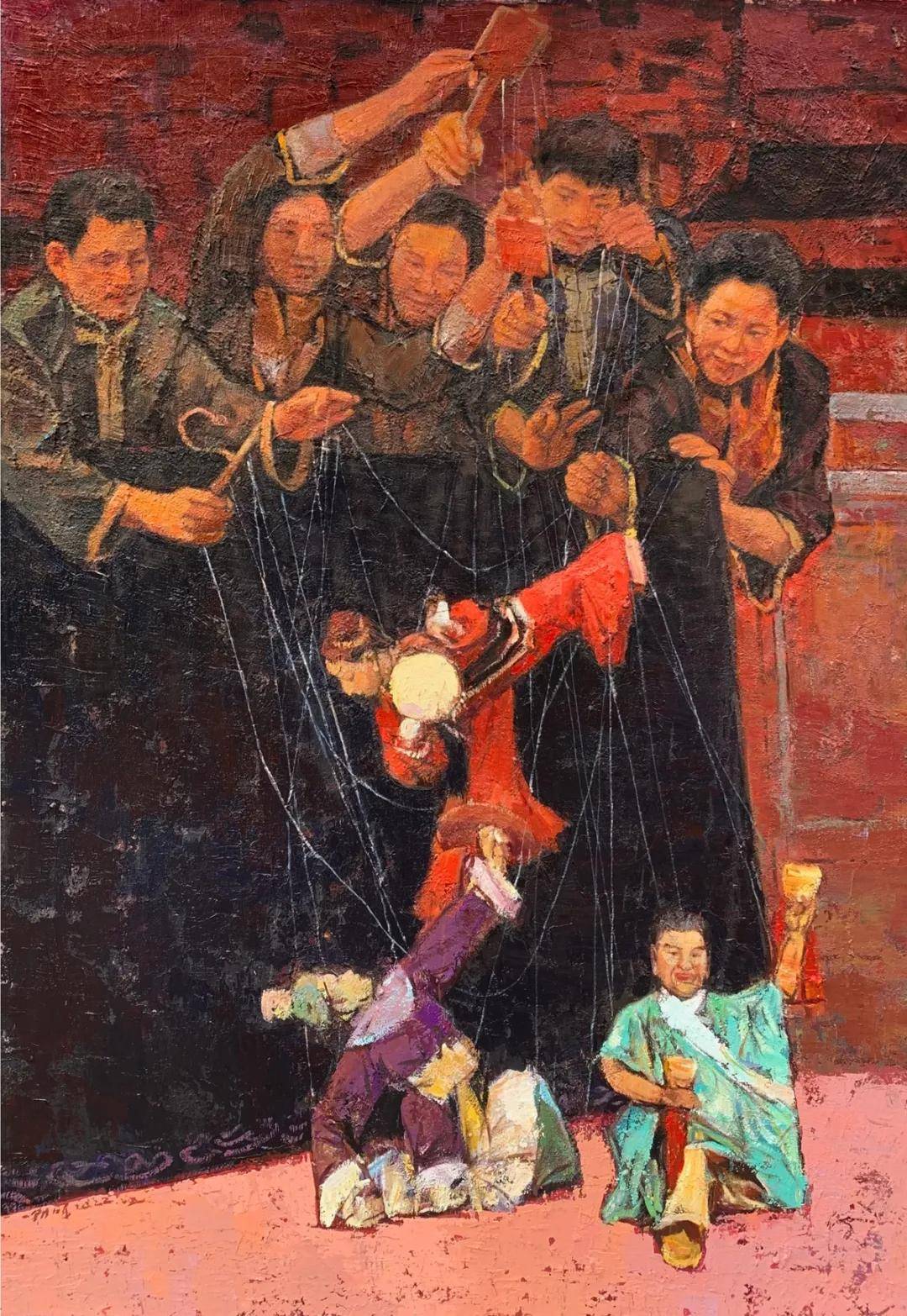 深褐与暗红的氤氲底色上,数道纤细而坚韧的丝线,自混沌幽暗的上方垂落,精准地绾系着下方那抹斑斓的木偶。这场景,既是对“悬丝傀儡”古老技艺的视觉复现,亦是一场关于“存在”的哲思悄然启幕。童年乡戏的记忆闸门倏然洞开:舞台方寸间,不见人影,惟见木偶翩然作舞,那份“木偶何以自行”的天真诘问,曾长久萦回我心,直至凝视卓朝晖的画作,方得觅见答案。