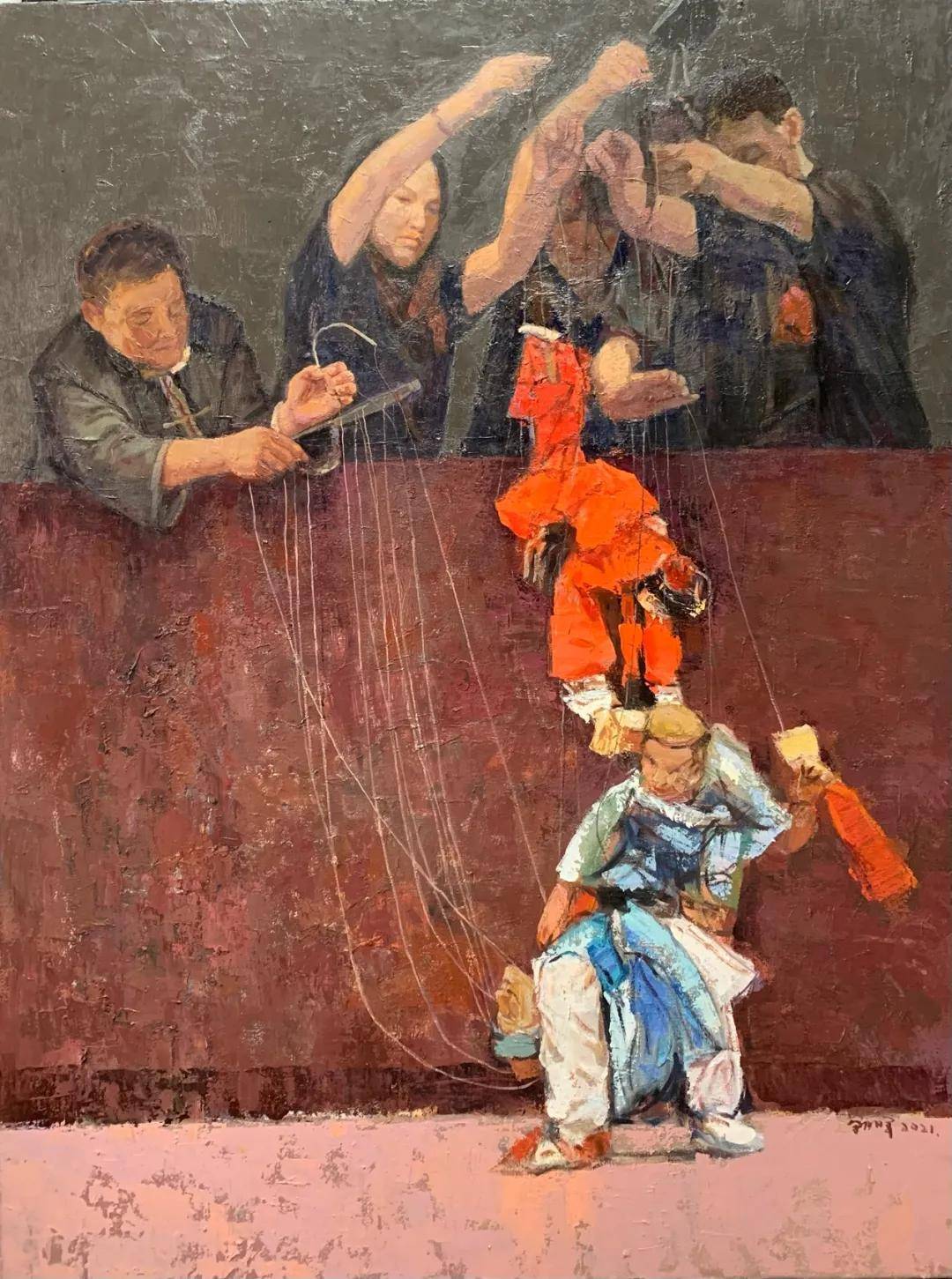 卓朝晖《汉唐遗韵-提线木偶戏五》 80cmx150cm 油画 2021年 然而,卓朝晖“提线木偶”的深刻之处,远不止于这般“形式与美学”的革新。他借这悬丝傀儡,直刺现代人“存在”境遇的核心命题。那些绾系木偶头、四肢、躯干的丝线,置于哲学的视野下,刹那间化作万千隐喻:是社会规训的无形绳索,是历史因袭的幽深脉络,是文化程式的潜在牵引,亦是人际关系的绵密羁绊。