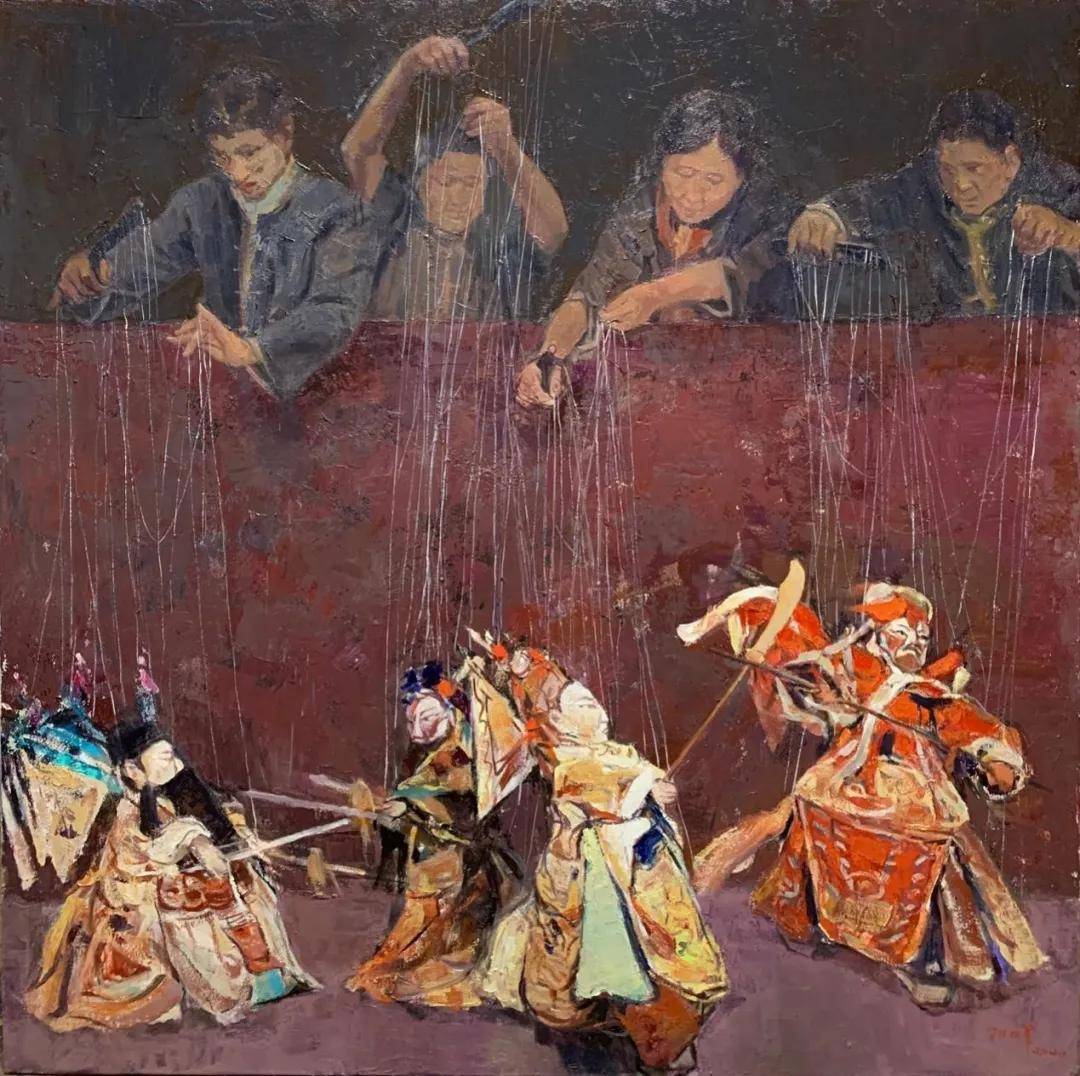 卓朝晖《汉唐遗韵-提线木偶戏一》 150cmx150cm 油画 2020年 提线木偶,古称“悬丝傀儡”,其艺“见于汉,兴于唐,盛于宋,发展于明清,延伸至当代”。莆仙画家卓朝晖,从故土民俗中敏锐撷取这一灵动意象。在他的笔下,那些由“勾牌”牵引的丝线,早已超越操控木偶头、手、腿、腮的物理工具之囿,升华为命运的经纬、精神的脉络,牵引出一场关乎“操控与自主”“程式与自由”“传统与新生”的深邃对话。