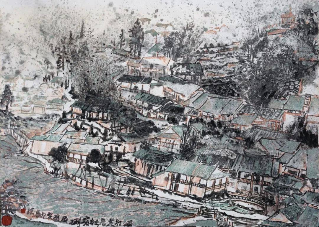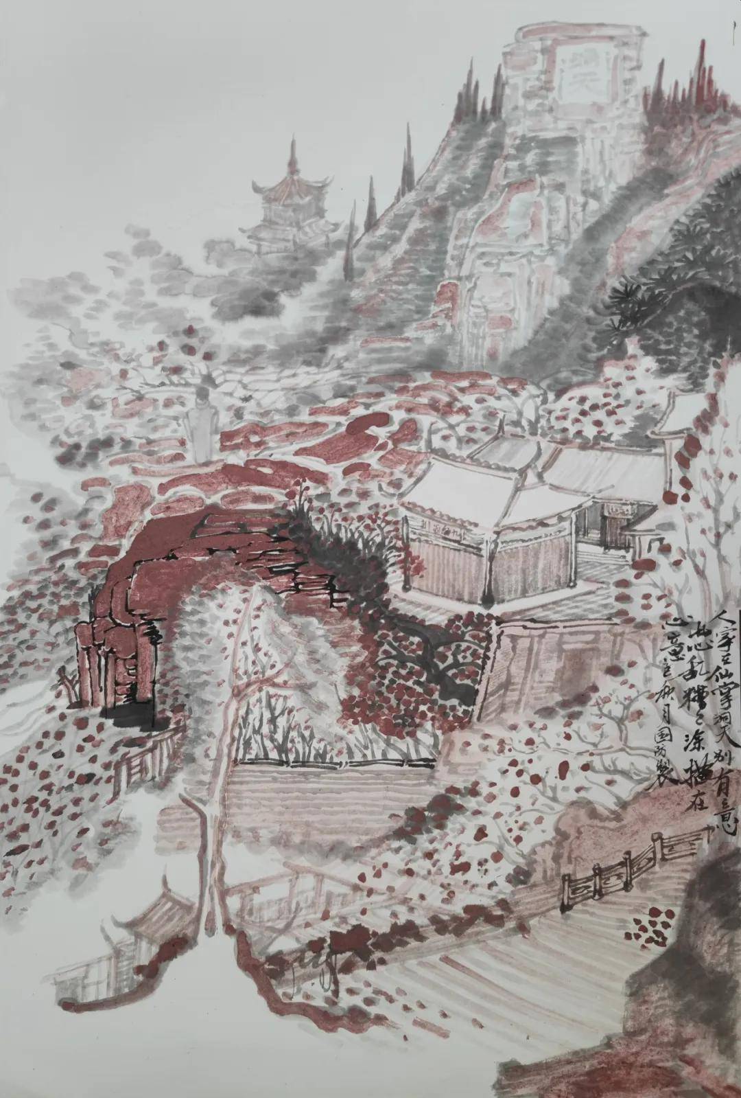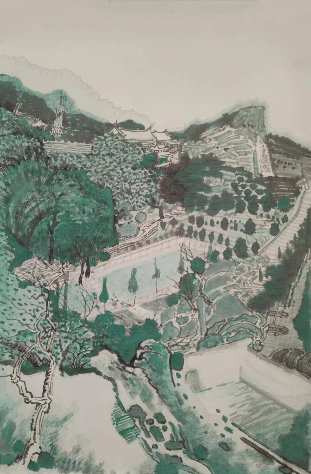 曾国防岩彩画《普陀山上普陀庵》 66cmx45cm 2026年 曾国防深谙闽地地域色彩之妙,将其精准进行矿物转译。他以闽南红(朱砂)谱写古厝墙垣的温暖记忆,以武夷绿(石青、石绿)的层次叠染,描绘山峦的葱茏意态,以海岸赭石的厚重质感,捕捉礁石的沧桑肌理。 在他的作品中,色彩不再是对自然的简单摹写,而是升华为承载闽地“耕海读山”生命哲学的视觉符号。作品中频繁出现的俯瞰视角,更将这种色彩叙事推向宏阔与精微的统一:既展现山海古村的整体格局,又在斑驳的红瓦与蜿蜒的绿埂之间,暗含对一方水土人文生态的深切关怀。 三、精神图谱:心象表达 升华嬗变 曾国防的艺术轨迹,呈现出从“对景写实”向“心象表达”逐步嬗变的清晰路径。其早期创作,如对寺庙、古建的描绘,像撰写视觉档案,致力于记录八闽大地上正在消逝的乡土记忆。《祥光缭绕》等作品中,岩彩的斑驳肌理本身就是一部“废墟与重生”的视觉史诗,唤醒了深藏于砖瓦间的历史对话。