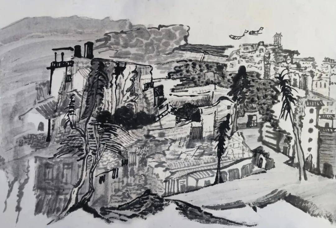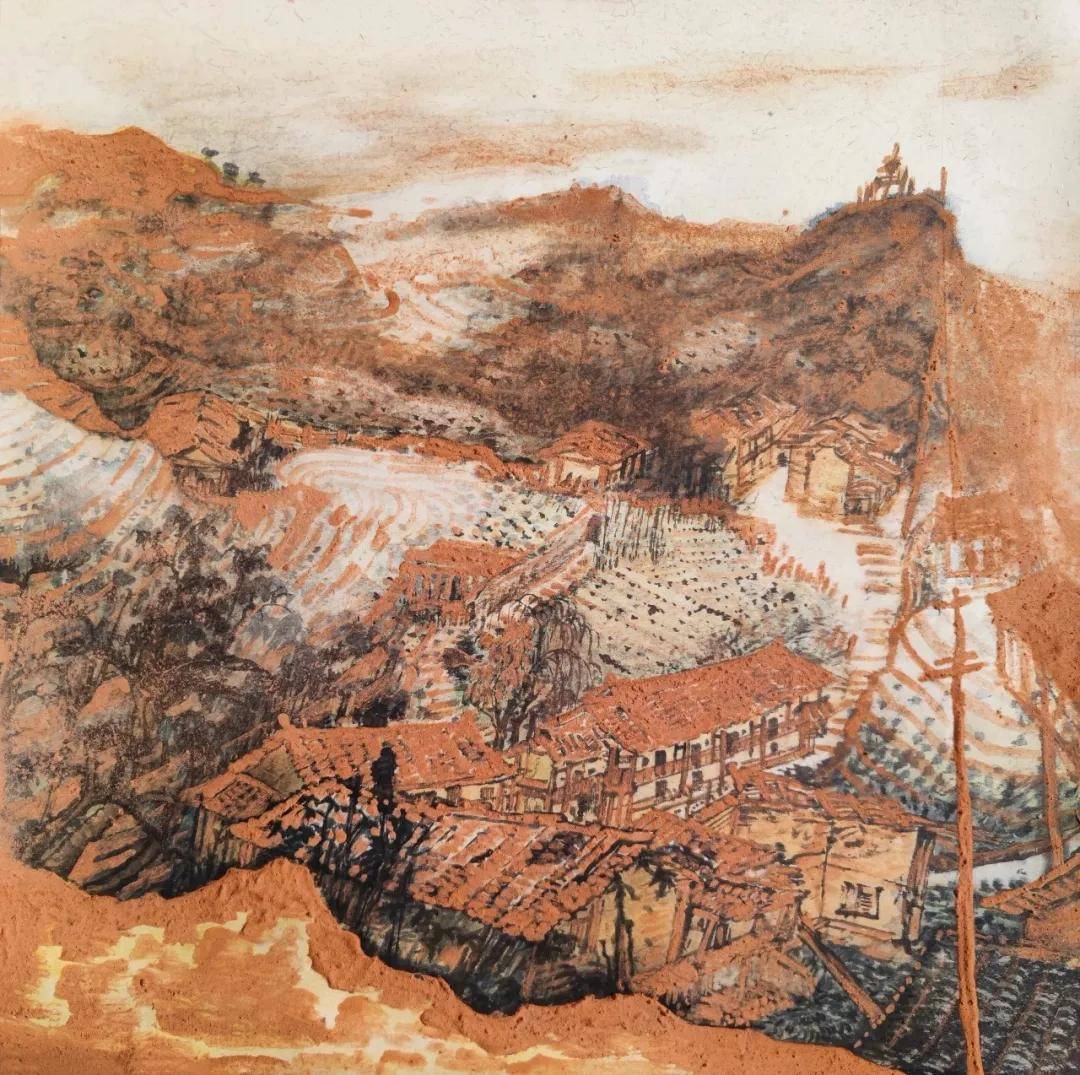 曾国防岩彩画《汀洋·鲁头》 50cmx50cm 2026年 曾国防的突破,在于构建了一种“新写意”的岩彩语言。创作中,他摒弃常规程序,在未干的底色上以毛笔勾勒线条,让线条既如传统绘画般,成为建构建筑与山峦的“骨”,又因岩彩的颗粒感,化作传递心境震颤的“肉”。