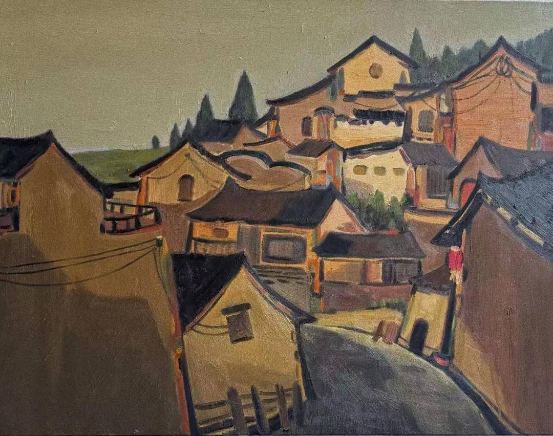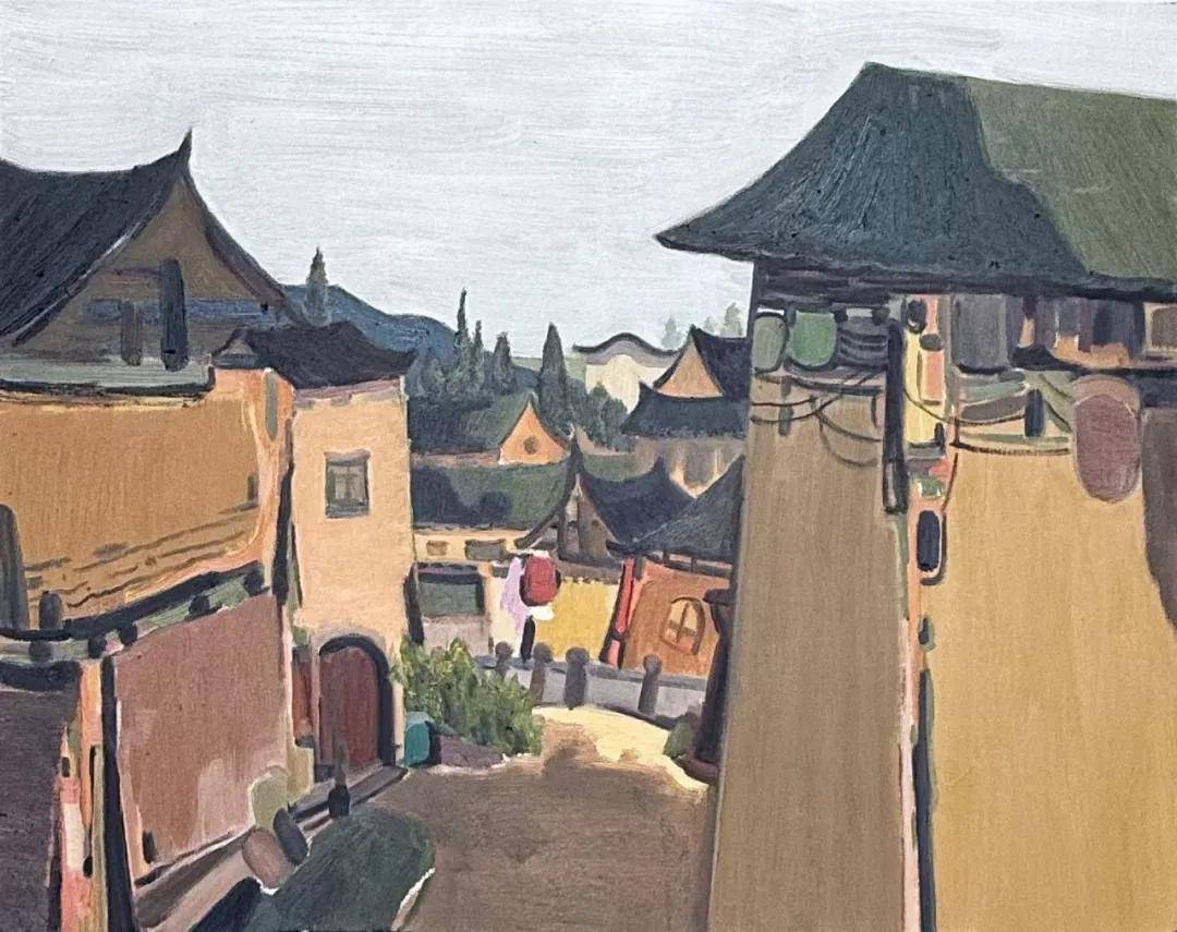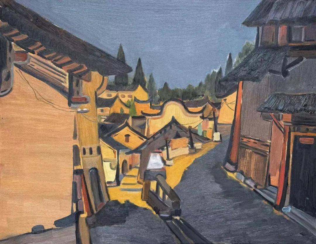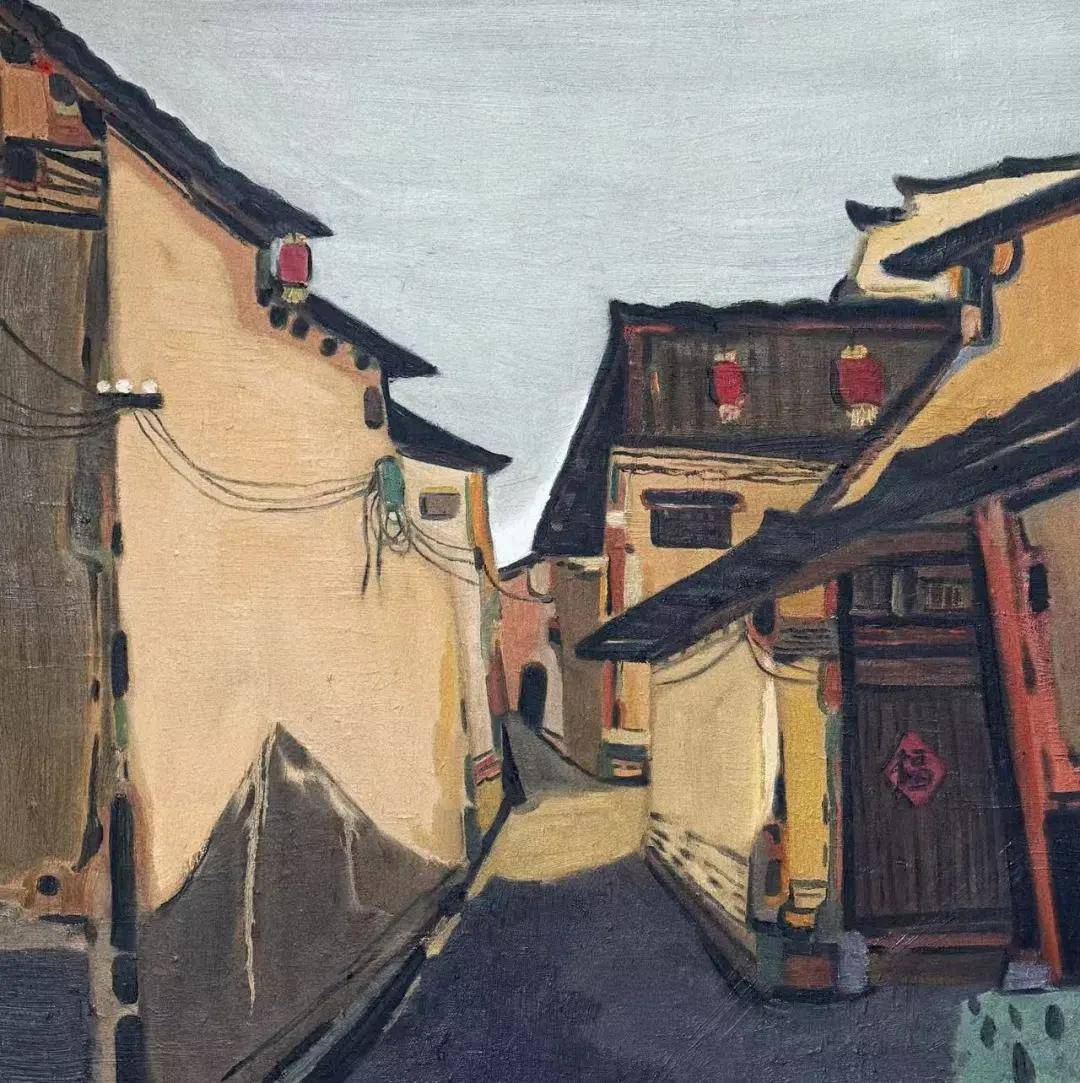 2025年陈允光麻黄梁写生作 下篇:闽东屏南 一、闽东古巷:冷调色彩里的历史厚重 从北方的炽热苍黄转入屏南,视觉仿佛被一场细雨清洗。这里的色调是沉静的冷韵:黛瓦的深灰、老木的赭褐、石阶的青黑、苔藓的墨绿,在湿润空气中显得饱满而含蓄。陈允光迅速调整了他的色彩系统。他降低了色彩的饱和度和明度对比,转而追求在高级灰色系中寻求无穷的微妙变化。这种色彩处理,与麻黄梁的“外放”形成鲜明对比,是一种“内敛”的美学。屏南古村的冷调色彩,在陈允光笔下,正是数百年耕读文明沉淀下的、宁静而深厚的心灵语言。