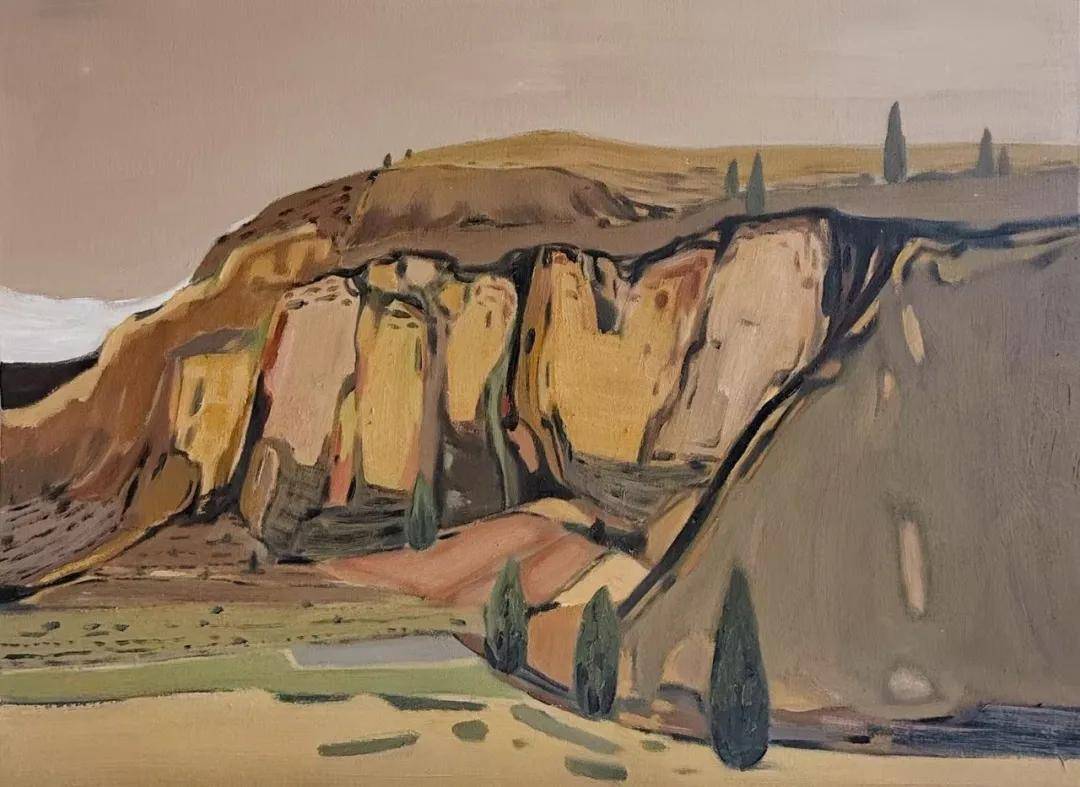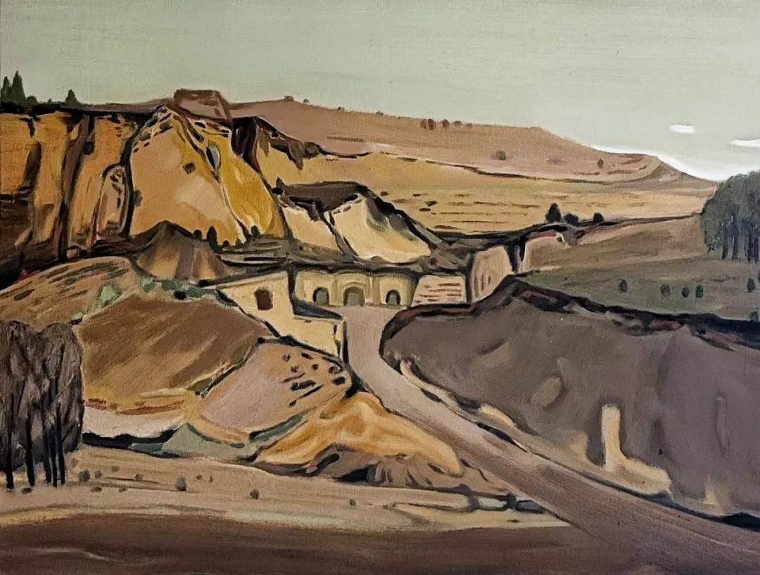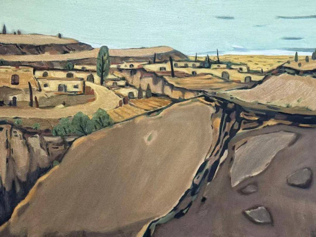 2025年陈允光麻黄梁写生作 三、烟火扎根:耕牧文明的黄土底色 苍茫并非死寂。陈允光敏锐地察觉到,黄土高原的精神内核,是农耕文明与游牧文明在这片苦寒之地上交织出的顽强生命力。窑洞,作为人类向黄土“借”来的栖居之所,是其作品中的重要人文符号。他描绘窑洞,并非将其作为孤立的建筑标本,而是将其置于宏大的自然背景下,作为人与自然关系的微妙注解。那从洞口飘出的炊烟,是家的温度;门前悬挂的玉米,是土地的馈赠;隐约的人影与牲口,是生生不息的日常。而这一切,虽未直接显于画里,却让人触景生情、无尽遐想。