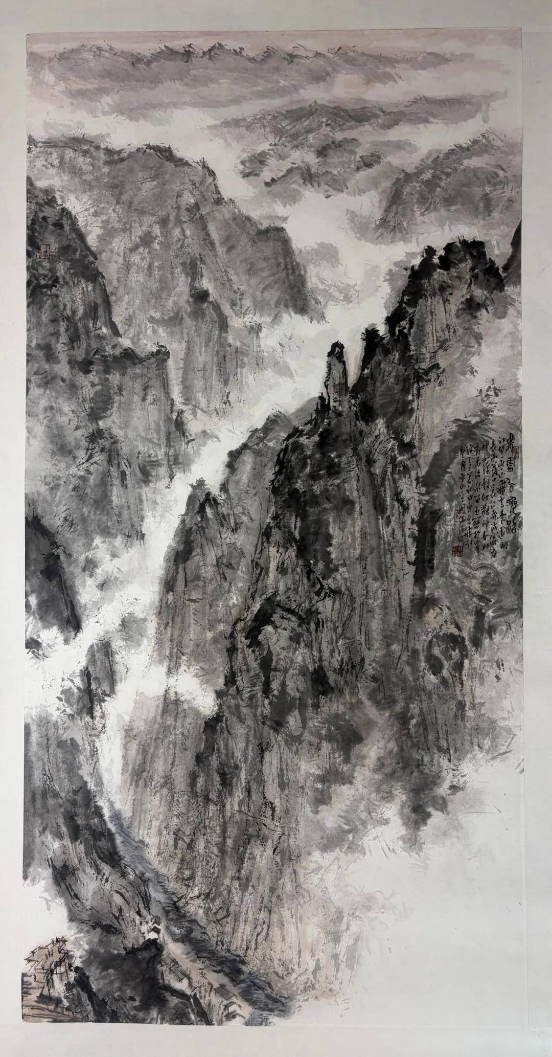 周波《巫山秋色满江城》 69cm x 138cm 中国画 2025年 一路行来,周波先后深入夔门、三峡之巅(桃山)、三峡龙脊与文峰塔、巫山神女天路四大胜境。每到一处,他不急于动笔,而是先静坐观山,听江声,看云起,待心境与山水相融,才缓缓铺纸研墨。在三峡之巅,云雾漫过肩头,远山如入仙境,他登高远眺,胸中顿生浩荡之气,也更加坚定了“大景大观”的创作初心——不画一隅小景,只写万里江山的开阔气象。