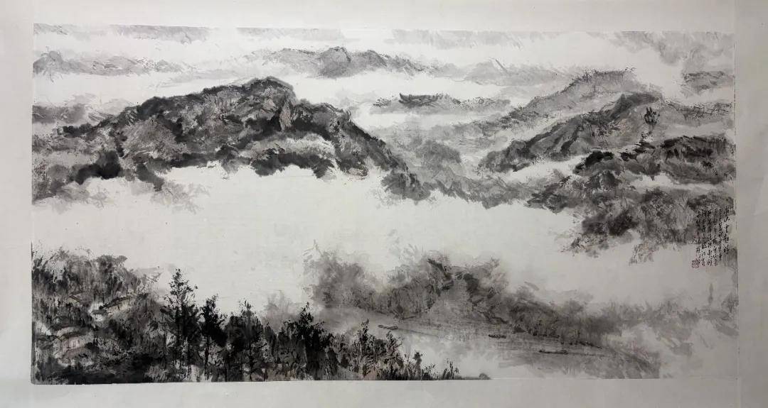 周波《巫山云起时》 69cm x 138cm 中国画 2025年 在巫山神女天路,他望着云雾缠绕的峰峦,想起“曾经沧海难为水,除却巫山不是云”的千古名句。眼前的山不再是单纯的石与土,而是藏着千年传说与文人诗意的精神家园。他落笔轻柔,墨色淡润,将神女峰的缥缈与灵秀,一点点晕染在纸上,让画面既有山水之形,更有诗意之魂。
