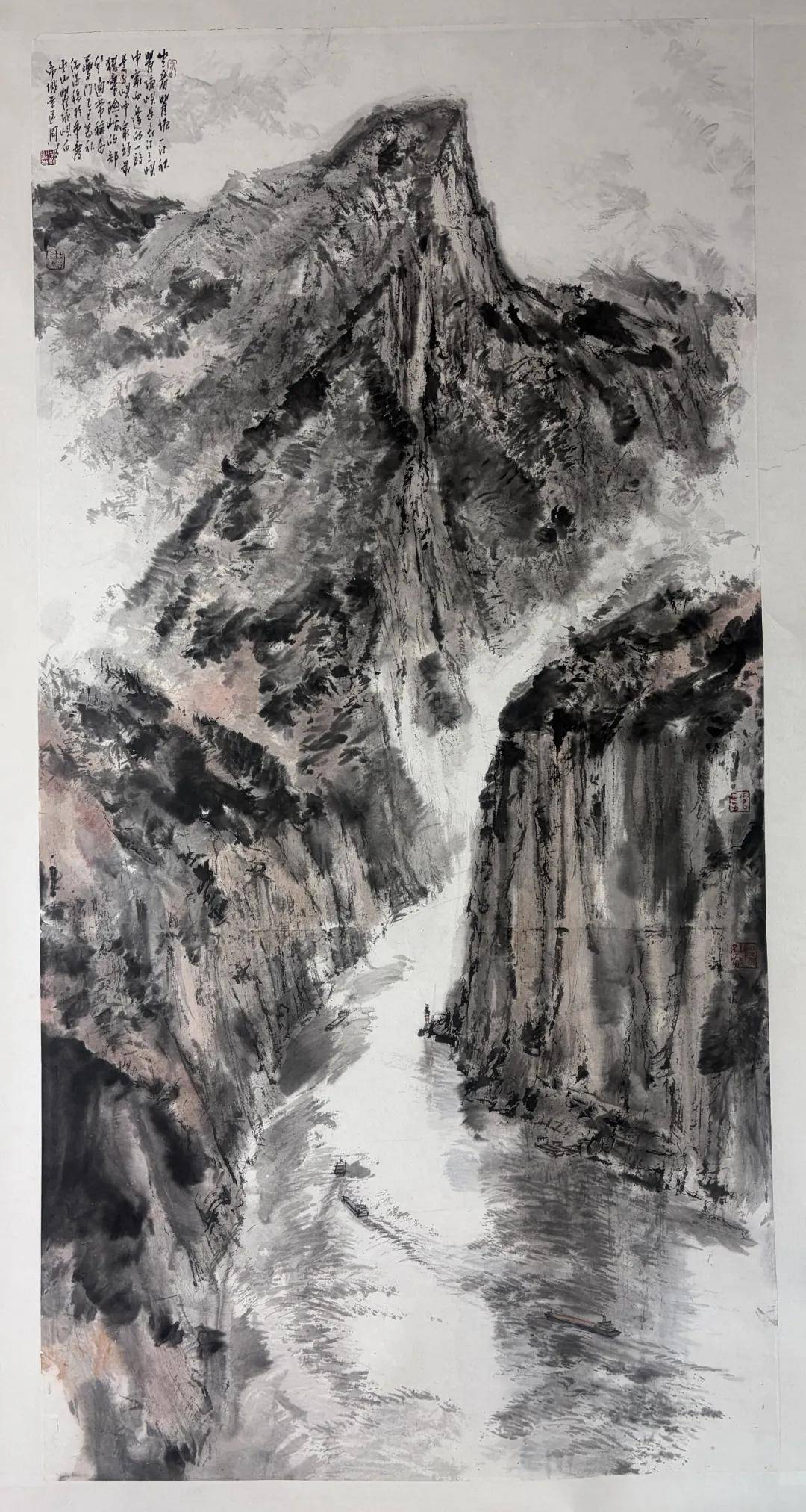 周波《九码烟波泊秋色》 138cm x 69cm 中国画 2025年 在九码头,他观察被船缆磨出深痕的石阶,留意往来行人的身影,将人间烟火与大江奔流一同入画;在白帝城,他迎着暮色写生,看晚霞为瞿塘峡镀上金边,心中涌起杜甫“无边落木萧萧下”的苍茫诗意;在夔门窄口,江风奔涌而来,吹得画纸簌簌作响,他以焦墨画峭壁,淡墨写远山,把“两岸猿声啼不住,轻舟已过万重山”的壮阔,定格成永恒的画面。