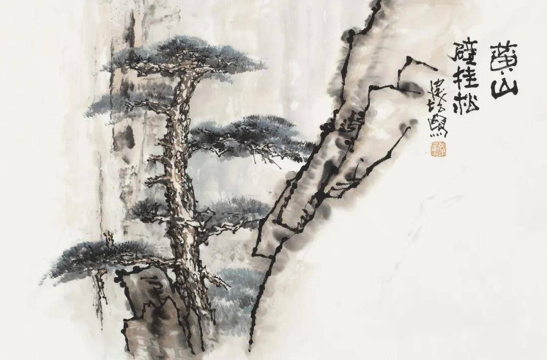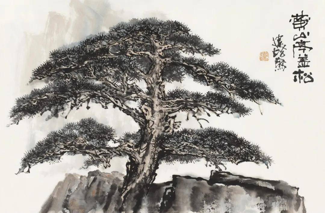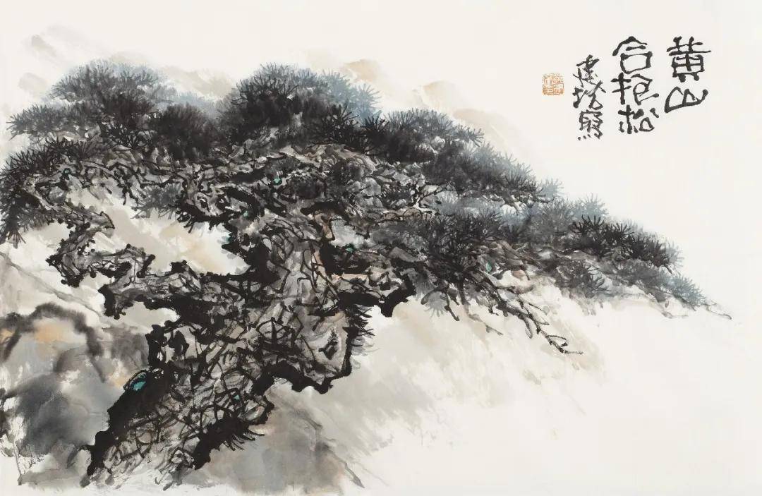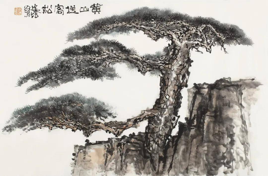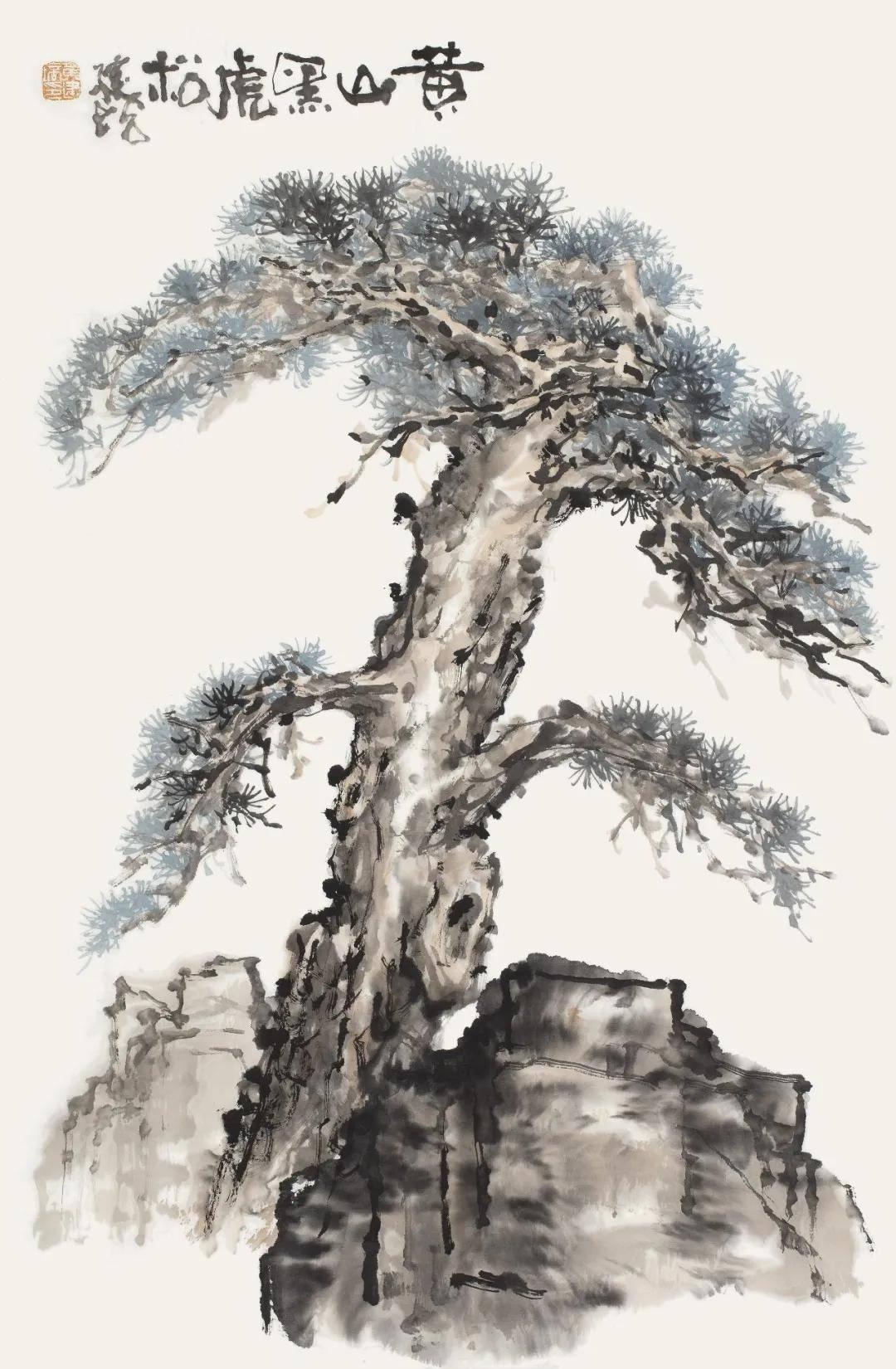 黄建培《黄山合抱松》 68cm x 46cm 2025年 四、墨里抒情:松之风骨与心性追求相契 纵观黄建培的笔墨,兼取苍劲与秀润之长。他善于运用焦、浓、重、淡、清墨色五变,以渴笔皴擦显松干之沧桑,以浓墨点簇见松针之精神,以淡墨晕染得云石之空灵。老辣而不枯败,雄劲而不霸悍,最终呈现出浑厚华滋、苍润相生的审美质感,契合荆浩《笔法记》所倡“气、韵、思、景、笔、墨”六要之旨。 黄建培一生爱松,根源在于松之精神与他的艺术追求、人生信仰高度契合。他画松,既守住传统文脉之根,又以自身数十年跨界实践注入新的气象。那历经风雨而不屈的松,是君子人格的写照,亦是艺术家以笔墨叩问生命的精神印记。黄建培以深厚书法功底为基,融雕塑之体量、壁画之格局于松石云水之间,使这一经典题材在当下焕发新的生机。