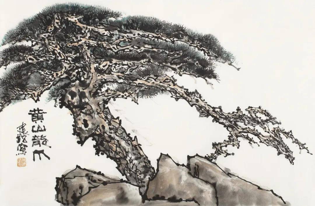黄建培《黄山龙爪》 68cm x 46cm 2025年 一、以线立骨:书法用笔与生命力表达 谢赫《古画品录》倡“六法”,以“气韵生动”为纲,以“骨法用笔”为核。张彦远在《历代名画记》中亦云:“骨气形似,皆本于立意而归乎用笔。”历代写松,或重姿韵、或重墨韵,而黄建培画松,深得“骨法”三昧。他自幼研习书法,从篆隶入手,数十年临池不辍,此次写松,更将书法笔意熔铸于画中每一根线条。笔下的松干松枝,不作平顺光滑之态,而是以中锋行笔,如锥画沙,顿挫如屋漏痕,转折如折钗股,渴笔显苍劲枯老,湿笔见圆润华滋。