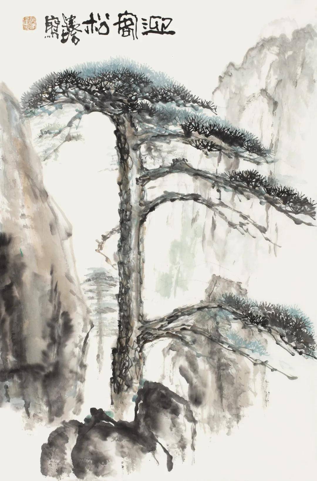 黄建培《迎客松》 68cm x 46cm 2025年 三、动静相生:云气留白间的黄山意境 中国画重意境,尤重虚实相生之理。老子云“知其白,守其黑”,道家“虚室生白”的哲学,在中国画中体现为对留白与云气的经营。黄建培在塑造奇松怪石之余,以大面积的留白与淡墨渲染,营造出黄山烟云变幻、空灵缥缈的气韵。这些云气,虚而不空,既是黄山“以云为衣”的真实写照,更是画面气脉流转、情思延伸的关键。